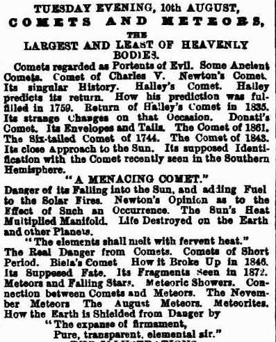 The day seems to be pretty well gone by now when the advent of a comet was universally regarded as a portent of war or pestilence, or a herald of the end of the world. When Halley’s comet in 1456, appeared contemporaneously with the advance of the Turks into Europe, all Christendom added a special supplication to the Litany, “From the devil, the Turk, and the comet, good Lord deliver us.” Now, I fancy, the only lingering superstition on the subject — and it is one which facts have undoubtedly done much to support — is the beneficial influence of comets upon the vintage.
