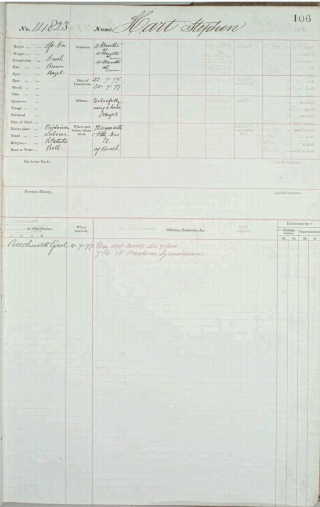 Convictions: July 1877 – 4 months (x3) for multiple charges of unlawfully using a horse.