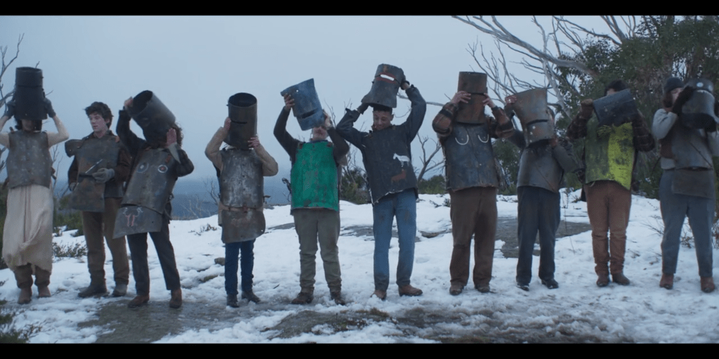 The lead up to Glenrowan is unlike anything we’ve seen before. Ned recruits an army of teenagers to fight his next battle. They swear on a Bible then take up a dress as their uniform. They each get a suit of armour, decorated to reflect the wearer (which usually means crude or vulgar graffiti or sloppy paint jobs) and line up to be shot at. Ned explains to his army, while marching along a replica train track made of sticks, that they will derail a train full of police. The ultimate aim seems to be mass murder. The sequence culminates in Ned hyping up his followers who are standing around a bonfire.