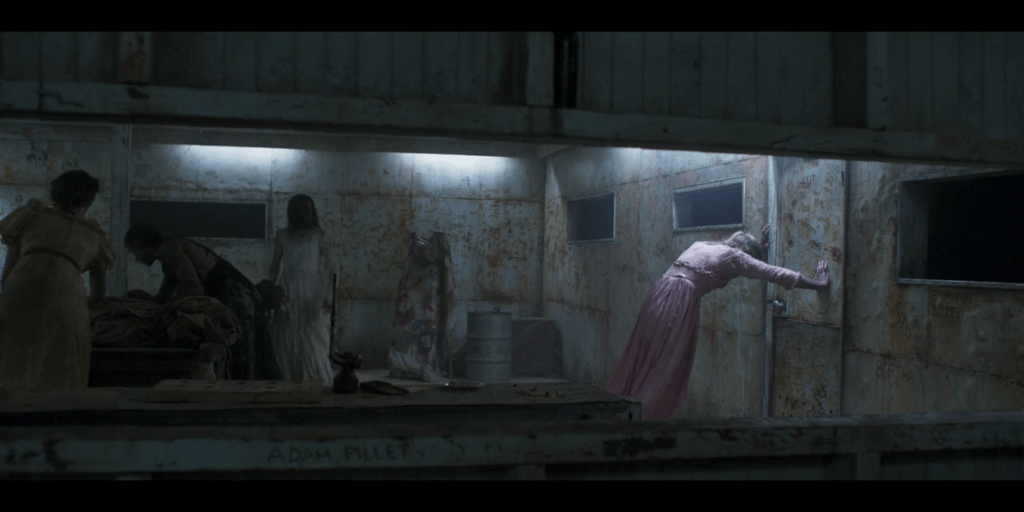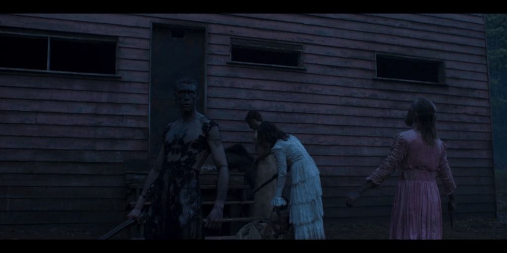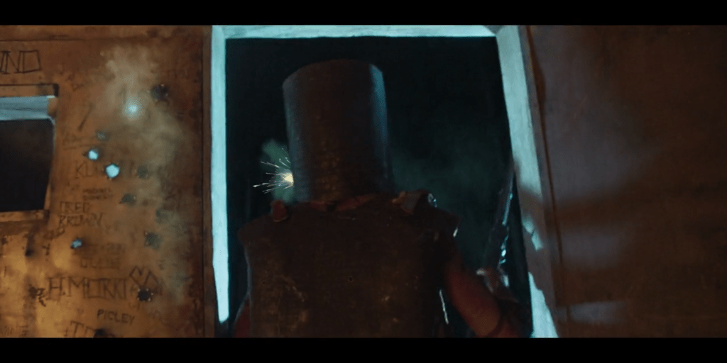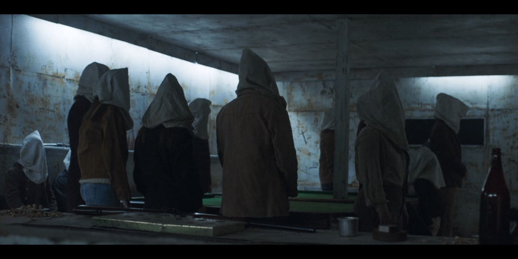 The gang then proceed to the Glenrowan Inn, which is built in a clearing in a forest. While the outside is wood panels, the inside is clad in metal (decorated with graffiti scratched into it.) And not only has it got electric lights, it also features a pool table with a support beam for the roof going through the middle of it. All of the windows are shaped like slots because it’s a conspicuous visual nod to the Kelly helmet. Standing still inside are the gang’s prisoners with white sacks over their heads. There is probably around a dozen people at most and all are dressed in modern clothing, including Thomas Curnow who looks like he has been clothes shopping at R.M. Williams. The number of prisoners in the inn during the actual events was over sixty, and there were no pool tables. We don’t see any of the dancing or sports that the gang used to keep the prisoners occupied while waiting for the train, though we do see Steve Hart drumming on an oil drum while Dan Kelly dances to the beat.