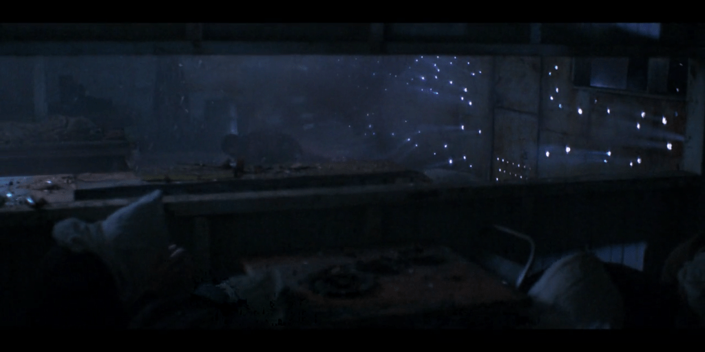 As the police disembark, they March in formation holding lanterns. The effect is like watching an old arcade game like Space Invaders. When we finally see the police themselves, they are in glowing white ponchos. The gunfight breaks out with the outlaws firing through the windows and the inn becoming riddled with bullet holes which shafts of light inexplicably come through. It is tense, explosive and utterly incoherent. Both Dan and Joe are mortally wounded.