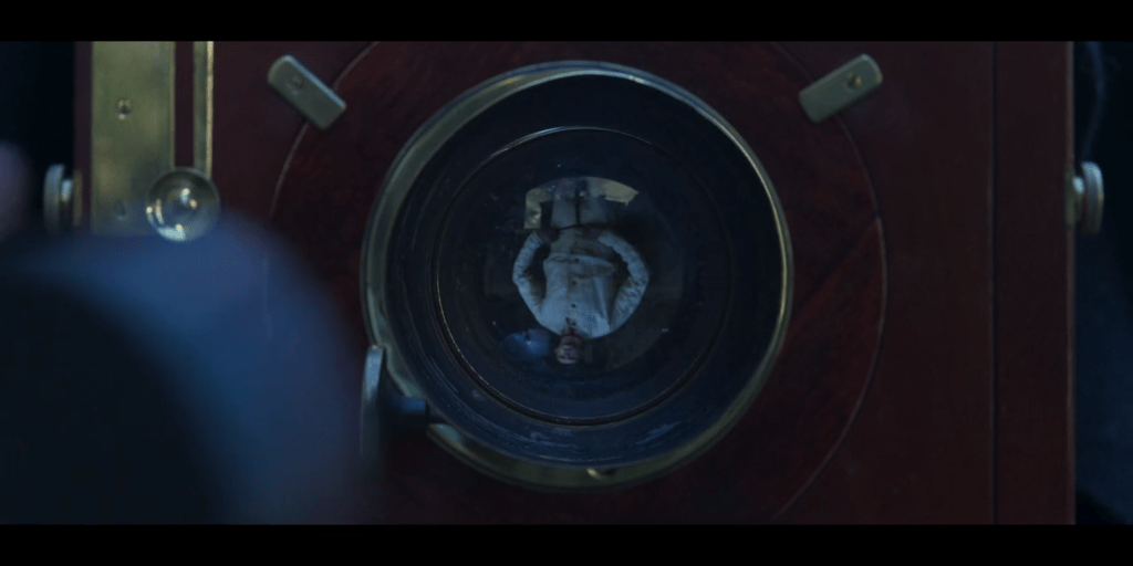 Ned marches out of the inn firing at the police and cussing them out. His eyes are wild within the helmet. We get the obligatory POV shot from within the helmet as well as many close ups of George Mackay’s eyes and a shot mounted behind his head like he’s wearing a GoPro or a playable character in a video game. Suddenly he turns and shrieks as he sees the Glenrowan Inn is now an inferno. A bullet hits the side of his helmet and he hits the ground a few feet away from the burning inn and falls unconscious. The police sit still and watch the fire from afar.
