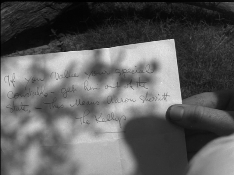 The scene in which the murder takes place is a strange beast. As with most aspects of the film it feels staged and directed like a play or pantomime. Joe stalks through the garden in broad daylight, planting his rifle in the garden bed. Aaron peeks out of the window. Joe calls to Aaron, saying he has something important for him. When the door is opened Joe fires his pistol. We never see Aaron on the other side of the door and he dies offscreen, which is obviously meant to have dramatic effect, leaving the viewer guessing as to how horrific the death must have been, though the film shows many police dying bloodless deaths throughout. Joe then turns, grabs his rifle and leaves. He and Ned then ride off to Glenrowan.