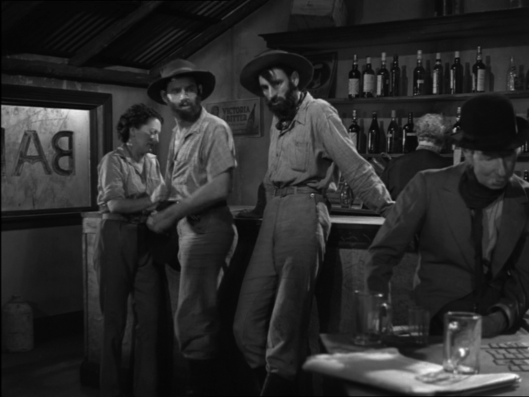 The greatest point of difference in this film to others depicting the Kelly story is that the Glenrowan Hotel is effectively Ned Kelly’s hangout. We frequently cut back to the characters in the pub talking about the gang’s exploits and filling the audience in on various aspects of the plot. At this point we see Joe grumbling to Ned as Kate Kelly arrives to tell them that a special train is coming. She explains that she heard it from Father Gibney who gives sermons to the police. Joe says Gibney is a police spy, presumably because anyone that spends any length of time interacting with police is obviously a spy. Kate begs Ned to escape but he refuses.