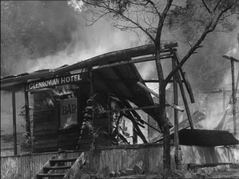 We see an inexplicable fire visible through the bar room window as the bushrangers fire at the police, likely a continuity error as we later see a man with a flaming torch setting fire to the verandah before being shot. Chaos ensues. Ned Kelly goes outside in his armour, but Dan runs outside and mounts his horse so he can ride away as fast as he can, leaving his mates behind to perish.