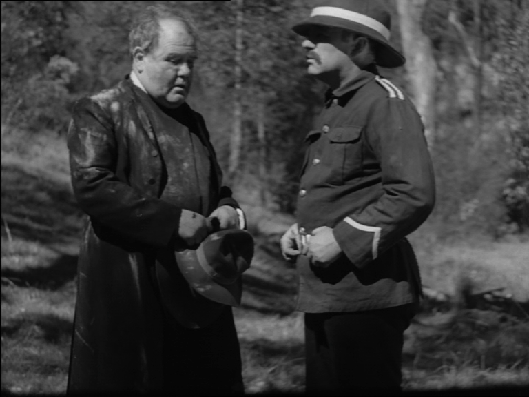 The hotel is burnt down and we see the portly Father Gibney talking to a policeman while covered in ash. Though it looks like someone threw the remnants of a campfire at the actor, it is meant to represent him having gone through the fire. The policeman interrogates him and the priest awkwardly attempts to draw out the tension by avoiding answering whether or not he saw Dan Kelly in the pub. After revealing that he didn’t and meaningfully looking at a hat he is holding (presumably Dan’s, though it looks exactly the same as everyone else’s) he turns dramatically and says he must go to Ned.