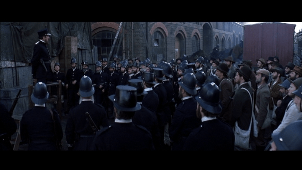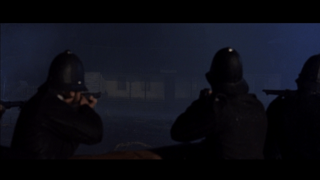 Ned tells the prisoners they are being let out as the police surround the inn. When the prisoners exit the police open fire killing at least one man. The prisoners retreat inside and mayhem ensues. Hare stands at the edge of his ranks like a British general with a subordinate on hand to hold an umbrella over his head to keep the rain off. Police send up flares to illuminate the front of the inn and soon the gang emerge in dramatic fashion.