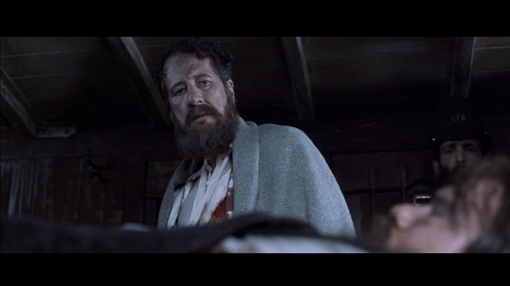 Having been taken to a train carriage for medical treatment, Ned lies still staring up as Dr. Nicholson removes the green sash. A priest stands nearby. Superintendent Hare enters, his arm in a sling, and takes the sash from the doctor. He asks Ned if he can keep it but Ned just stared at him. As the train pulls away Ned stares out the window at some children and that’s the end of the film. It’s a strange and unsatisfying conclusion.