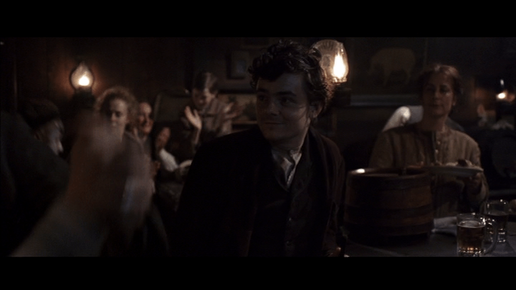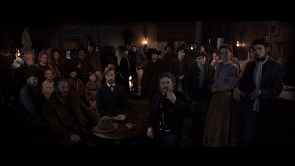 Ned gives a speech to his prisoners about how he and his gang are the most wanted men in the British Empire. This scene has a very low energy and seems almost awkward as the crowd stares silently at Ned who mumbles his way through the speech. The moment feels unrehearsed, but not in an intentional way. Following this there is a party and while everyone drinks, dances and dines Ned sits on a bed with his pistols. Jane Jones enters with refreshments and they reminisce about the time Ned took her riding (a scene from the beginning of the film.) Of course, as the real Jane Jones was fifteen during the events of June 1880 and never knew Ned up to this point, this horseriding moment would never have happened. This interpretation of Jane is merely a device to allow a moment of reflection on Ned’s character development.