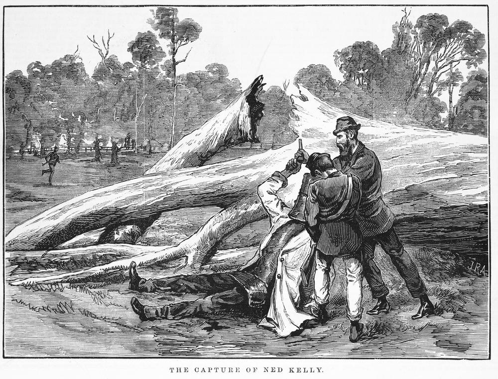 The morning broke beautiful and clear. The police were dispersed all round the hotel, when they were beset by a danger from the rear. Ned Kelly was the cause. It appears he was the man who shot Mr. Hare, and he himself was wounded in the arm by the fire which was returned. He could not without danger get into the hotel, so he sprang upon his horse, and during the excitement which followed he got away towards Morgan’s Lookout; but it was not the intention of the bold ruffian to desert his comrades, and he returned to fight his way to them. It was nearly eight o’clock when his tall figure was seen close behind the line of police. At first it was thought he was a blackfellow. He carried a grey coat over his arm, and walked coolly and slowly among the police. His head, chest, back and sides were all protected with heavy plates of quarter-inch iron. When within easy distance of Senior-constable Kelly, who was watching him, he fired. The police then knew who he was, and Sergeant Steele, Senior-constable Kelly, with Mr. Dowsett (a railway guard), fired on the ruffian. The contest became one which, from its remarkable nature, almost defies description. Nine police joined in the conflict and fired point blank at Kelly; but although it was apparent that many of the shots hit him in consequence of the way in which he staggered, yet he always recovered himself, and tapping his breast, he laughed derisively at his opponents, as he coolly returned the fire, fighting only with a revolver. It appeared as if he was a fiend with a charmed life. For half an hour this strange contest was carried on, and then Sergeant Steele rapidly closed in on him, and when within only about 10 yards of him he fired two shots into his legs and this brought the outlaw down. He was only wounded, and appeared still determined to carry on the desperate conflict, but Steele bravely rushed him and seized the hand in which Kelly held the revolver, the only weapon with which he was armed. He fired one shot after this, but without effect. When on the ground he roared with savage ferocity, cursing the police vehemently. He was stripped of his armour and then became quite submissive, after which he was borne to the railway station by Sergeant Steele, Constable Dwyer, and two representatives of the Melbourne press. Great praise is due to Guard Dowsett for the plucky manner in which he assisted the police. He was armed with a revolver, and got very close to the outlaw. At the railway station Kelly appeared weak from the loss of blood, and some brandy was given him. He was examined in the guard’s van by Dr. Nicholson and Dr. Hutchinson, who found that he was suffering from two bullet wounds in the left arm, a bullet in the right foot, near the right toe, and two wounds in the right leg, those inflicted by Sergeant Steele.