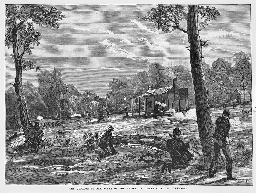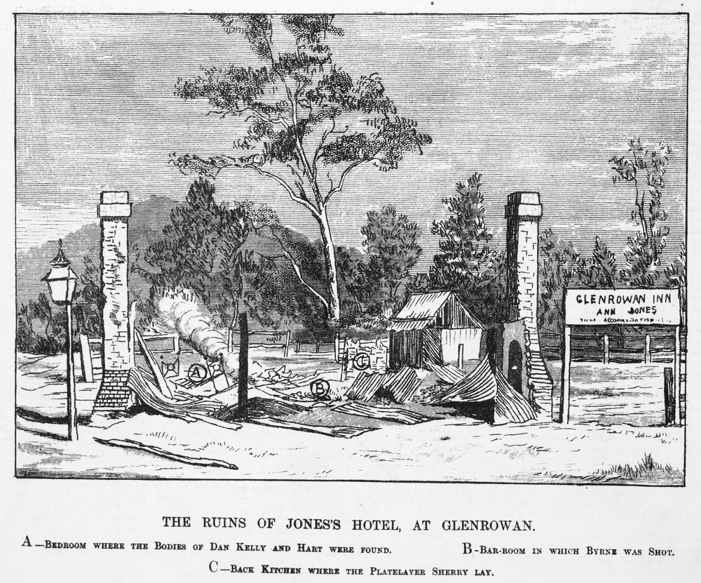 The township of Glenrowan consists of about half a dozen houses, inclusive of two bush hotels, Jones’s Glenrowan Hotel being about 200 yards from the station on the west side of the line, whilst McDonald’s Hotel is about the same distance on the other side of the line. On arriving, the occupants of the train were convinced by the report of a shot fired from Jones’s Hotel, that they were in the presence of the desperate outlaws. The next few minutes were productive of painful excitement. The police abandoned the horses and rushed to their arms. The black trackers sprang forward with their leader, and soon took up a position in front of the house. Mr. Hare could be plainly seen by the light of the moon. He walked boldly towards the hotel, and when within about twenty-five yards of the verandah, the tall figure of a man came round a corner, and fired. The shot took effect on Mr. Hare’s wrist, but Kelly found in him a foeman who would not shrink from him. Senior-constable Kelly and C. C. Rawlings, a volunteer, were close to him, and the former promptly returned the fire, which was taken up by Mr. Hare, although wounded, and Mr. Rawlings followed his example. Just before Superintendent Hare was wounded, Constable Bracken, the local policeman, who had been made prisoner in the hotel, courageously made his escape, and running towards the railway station, he quickly spread the information that the Kellys, with about forty prisoners, were inmates of the hotel, which was a weatherboard building containing about six rooms, inclusive of the bar. Behind the building there was a kitchen, the walls of which were constructed of slabs. Into this the police fired. When about sixty shots had been sent into the walls of the building, the clear voice of Hare was distinguished above the screams of the terrified women and children who were in the hotel, giving the order to stop firing. The Kellys fired three or four more shots, after which one of them gave vent to coarse and brutal language, calling to the police, “Come on, you b—— wretches, and you can fire away; you can never harm us.” After the lapse of about a quarter of an hour, Superintendent Hare approached the station, and stated that be had been wounded in the wrist. The wound was a very bad one, and was bleeding very much. There was no doctor present, but the representatives of the press succeeded in stopping the rapid loss of blood. During the trying ordeal Mrs. O’Connor and Miss Smith remained unwilling witnesses of the terrible scene. They retained their seats in the railway carriage, and the bravery which they displayed, notwithstanding that the bullets from the outlaws whistled past the train, surely ought to have had a good effect on the men who were facing death in the execution of their duty. Seeing the wound, the ladies implored Mr. Hare not to return to the fight, but he did so. His reappearance in the trenches was the signal for renewed firing, and the valley was soon filled with smoke. Mr. Hare then became faint from loss of blood, and was compelled to leave the field. He went back to Benalla on an engine in order to have his injury attended to, and send more men to the front. A long and tedious interval followed, during which time Mr. Stainstreet, the stationmaster, suddenly left the hotel, where he had been kept prisoner with the other residents of Glenrowan. He walked boldly away, and had a narrow escape of being shot by the police, but he saved himself by proclaiming he was the stationmaster. He reported that the gang were still in the house, and that the shots of the police had struck the daughter of Mrs. Jones, a girl 14 years of age, on the head, whilst the son, John Jones, a boy of nine years, was wounded in the hip. Very soon after this, painful hysterical screams of terror were heard from Mrs Jones and a Mrs. Reardon, both of whom were walking about the place, disregarding the danger to be feared from the volleys which the police, at short intervals, poured into the hotel. The police frequently called upon the women to come away, but they hesitated, and Mrs. Reardon and her son were frightened to accompany Mr. Reardon to the station. The poor woman was carrying a baby only a few months old in her arms, and she eventually ran to the station, where she received every kindness from the persons there assembled.