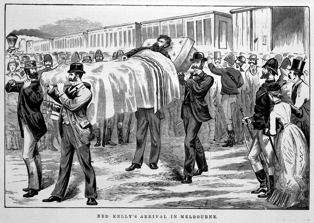 The excitement that was created in Melbourne by the intelligence of the latest outrage of the Kelly gang, and of their capture at Glenrowan, was intensified on Tuesday when it became known that Edward Kelly, the one survivor of the band of desperadoes, was on his way to Melbourne. In the anticipation of obtaining a view of the notorious bushranger, a large number of persons assembled at the Spencer street station, and it was found necessary to bring the barricades used on occasions of unusually heavy traffic into use in order to keep the people clear of the train. A goodly number of people also went to the Essendon station, believing that the prisoner would be removed from the train there, and taken as quietly as possible to the Melbourne gaol. At the North Melbourne station, which had been selected as on the whole the most convenient place for taking him out of the train, several hundreds of people had assembled to await the arrival of the train from Wodonga. Shortly before 2 o’clock the ordinary train arrived at North Melbourne, and the passengers soon informed the excited crowd that Kelly was in the van of the train. The platform was rushed, and the crowd tried every means of obtaining a glimpse at the prisoner. Kelly was in charge of Senior-constable Walsh, Senior-constable Coghlan, and Constables Griffin, Banker, and Waldron. Dr. Charles Ryan also travelled in the van, and was unremitting in his attention to his patient during the long journey. On arriving at North Melbourne station, inspector Montford took charge of Kelly, who was placed on a stretcher, and lifted in a waggonette in waiting for him. His removal was to some extent impeded by the crowd which pressed round the van, and was with difficulty kept back. The patient lay perfectly helpless. His face wore a wan appearance, indicative of prostration, and his hands and feet were bound up. Although he looked at the crowd with some interest, all the look of bravado had gone. There was no demonstration of any sort made by the crowd, although the female section expressed commiseration for the worn-out, broken-down, and dejected appearance of one who had become known to them as a man of reckless bravery and of great endurance. The waggonette was rapidly driven by a direct course to the Melbourne gaol. Along the route numbers of men, women, and children rushed out from factories, shops, and private residences, and followed the waggonette, eager to obtain a glance at the prisoner. At the Gaol, 600 or 700 persons had assembled. The waggonette drove up at a brisk pace, and was taken into the gaol-yard before the people had time to obtain even as much as a glimpse at it. As it entered the gaol-yard, three cheers were called for, and mildly responded to by the crowd, but the manner in which they were called for and given left it a matter of doubt whether they were intended as a recognition of the success of the police officers who drove up their captive, or as a manifestation partly of sympathy with and partly of recognition of the prisoner’s reckless daring. When safely lodged within the gaol walls, the prisoner was given over into the hands of the governor, Mr. Castieau, who had him immediately removed to the gaol hospital. Dr. Shields, of Hotham, the health officer for the gaol, was sent for, and was soon in attendance. He found the patient to be in a feverish state. A wound on the left foot showed that a bullet had passed through it. In the right arm there were two serious wounds, which had been caused by a bullet going right through the fleshy part of the lower arm. The right hand was seriously injured, and in the right leg there were found no less than eight or nine slugshots. Dr. Ryan was also in attendance, and the opinion of both medical gentleman was that Kelly would in all probability recover from his injuries, serious as they were, and notwithstanding the despondency and loss of spirit shown by the prisoner, who has never concealed the fact that he would rather die in any way than allow the law to take its course. During the afternoon the prisoner’s condition improved, and he became more communicative than at the time of his departure from Glenrowan. Almost immediately after his admission to the gaol, Kelly was visited by the Rev. J. P. Aylward, who had a short interview with him. Upon that rev. gentleman devolved the duty of conveying to Kelly’s mother, who is undergoing her sentence in the same gaol, the first intimation of the destruction of the gang, of the death of Dan Kelly and Hart, and of the capture and removal to Melbourne of Edward Kelly. On the journey to Melbourne and after his arrival Kelly conversed tolerably freely at times with those round him, but divulged little that was new with regard to the proceedings or intentions of his gang. He was specially reserved in his references to his late mates, and as a rule declined to say anything about them. In reply to a question as to whether he had on any previous occasion been in Melbourne, he said that he must decline to answer it. He stated that the police had taken the gang unawares, and that finding that the police had discovered their whereabouts through the murder of Sherrit, the attempt to upset the special train was had recourse to as a desperate last resource. Kelly spoke frequently of his determination to bring the black trackers to grief, and alluded to that as one strong motive for the act in question. At a late hour last evening Kelly was progressing favorably, and his medical attendants considered him out of danger. Superintendent Hare returned to town by the train in which Kelly was brought, which was, as previously stated, an ordinary passenger train, and brought down a very large number of passengers. The superintendent proceeded direct to Spencer street. The large crowd, which had been gathered there in anticipation of seeing Kelly himself, soon recognised Mr. Hare, and cheers were given him with enthusiasm as he alighted from the train. He w