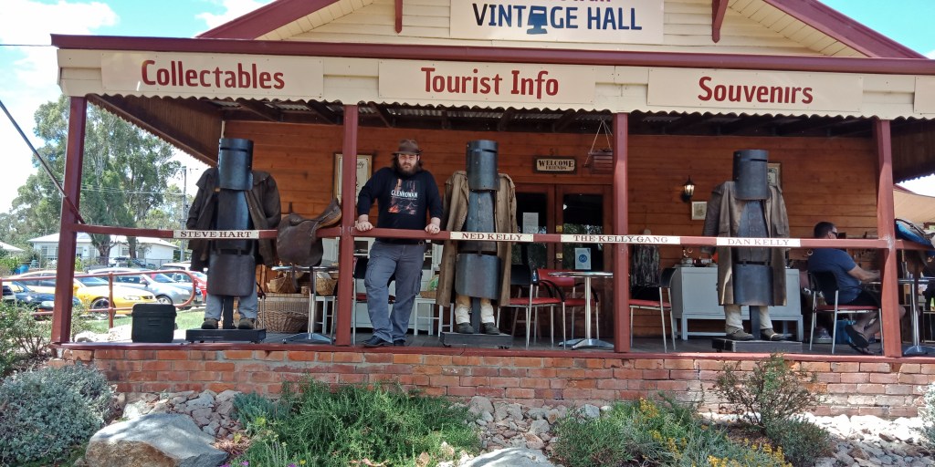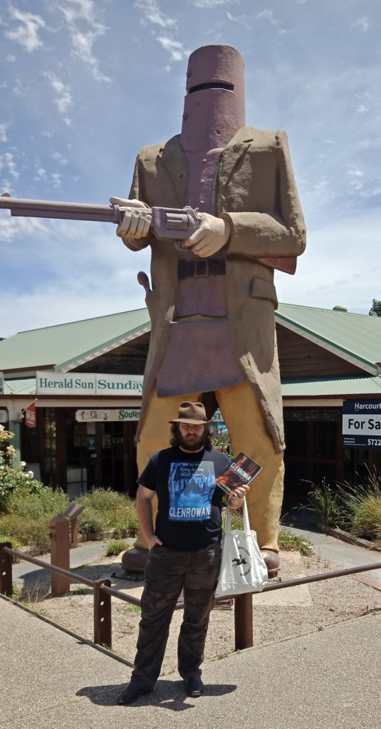 From Wangaratta we headed for Glenrowan. The heat was starting to build up but the old chariot was holding up admirably. We parked near the Big Ned, which seemed like a great idea at the time, but the unrelenting heat would cause my car to chuck a wobbly (literally) when we later went to drive to the accommodation. A quick stop into the post office meant one lucky reader had their copy of the novel sent out from behind the Big Ned. It remains the only copy sent out from Glenrowan to date.