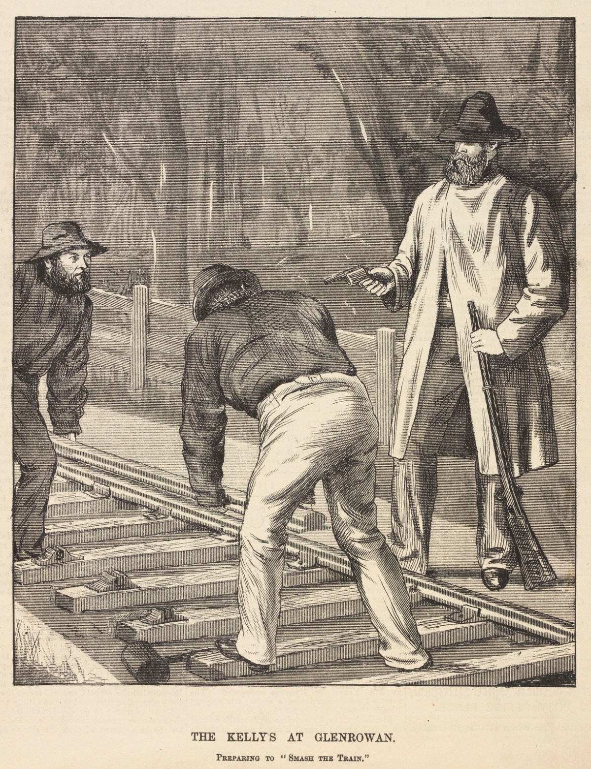 The whole of the members of the gang were very jolly, and Ned told us that they had come there to settle the black trackers, and that he would be on the spot when the train ran over the culvert, and would shoot all who were not killed. We knew we could do nothing, and therefore did not take any steps to warn those in the train of the danger. Every member of the gang was then sober. They showed us their armor, and seemed to think that the police could do them no harm. At half-past two on Monday morning Ned Kelly said something to the effect that he did not think the special train was coming, and I then asked him if we could go home. He said ‘Yes,’ and I thanked him.
